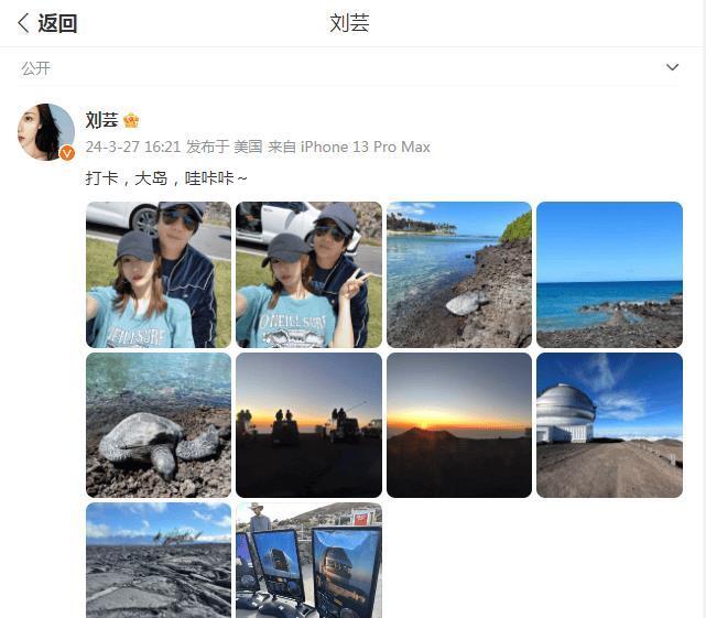 3月27日,刘芸在个东说念主的卤莽平台上共享了一组旅行好意思照,并为此配文:“打卡,大岛,哇咔咔~”。随后,刘芸责任室也转发宣传:“度假倒计时了,欢快玩”,这也受到了网友们的平时热心。